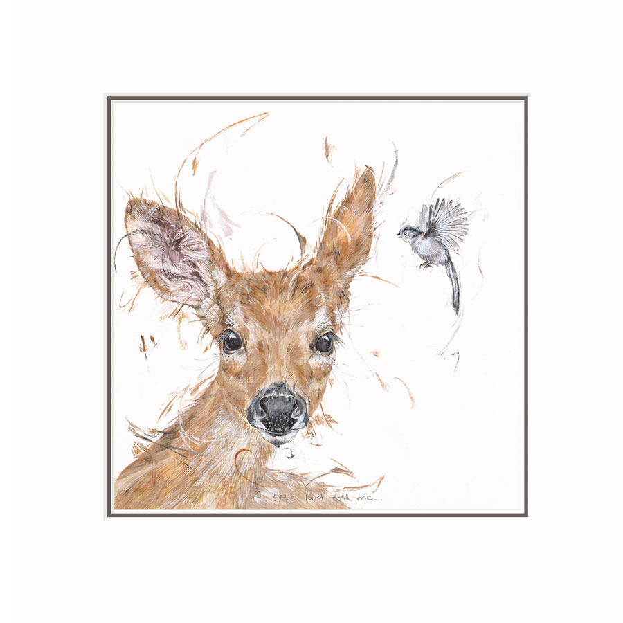 A Little Bird Told Me | A signed limited edition artwork by Aaminah Snowdon. Presented in a v-groove conservation mount available framed ready to hang in a selection of quality wood mouldings, along with the amazing AR Glass. All signed, numbered and comes with a Certificate of Authenticity.