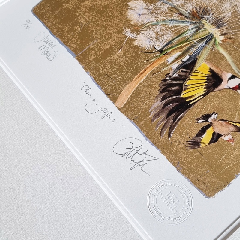 Charm on Goldfinch | A signed limited edition premium giclee with hand applied ‘gold’ leaf on 330gsm Somerset enhanced velvet fine art paper. Signed by Jackie Morris and Robert Macfarlane