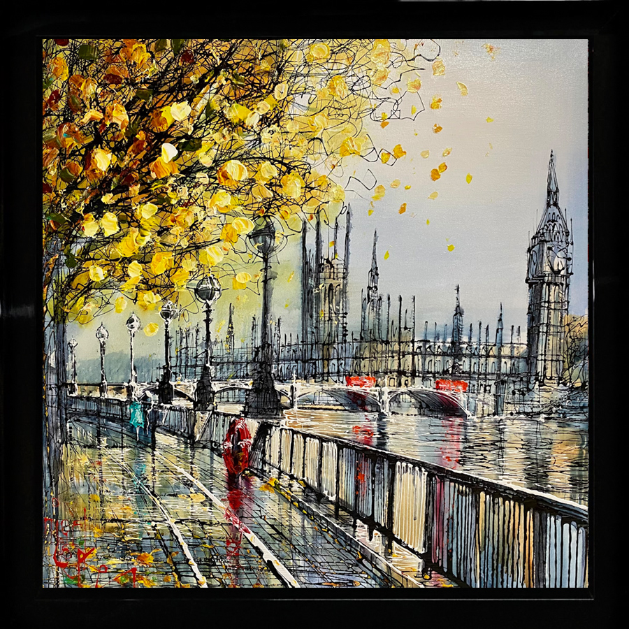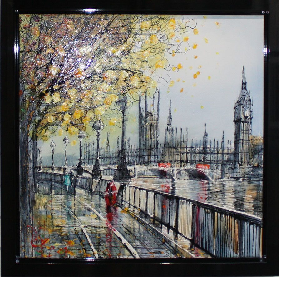 London Spires | A Cityscape Original Painting by Nigel Cooke. Presented on box canvas and float framed ready to hang in a piano gloss black frame. All signed and comes with a Certificate of Authenticity. The texture and finish is truly stunning.